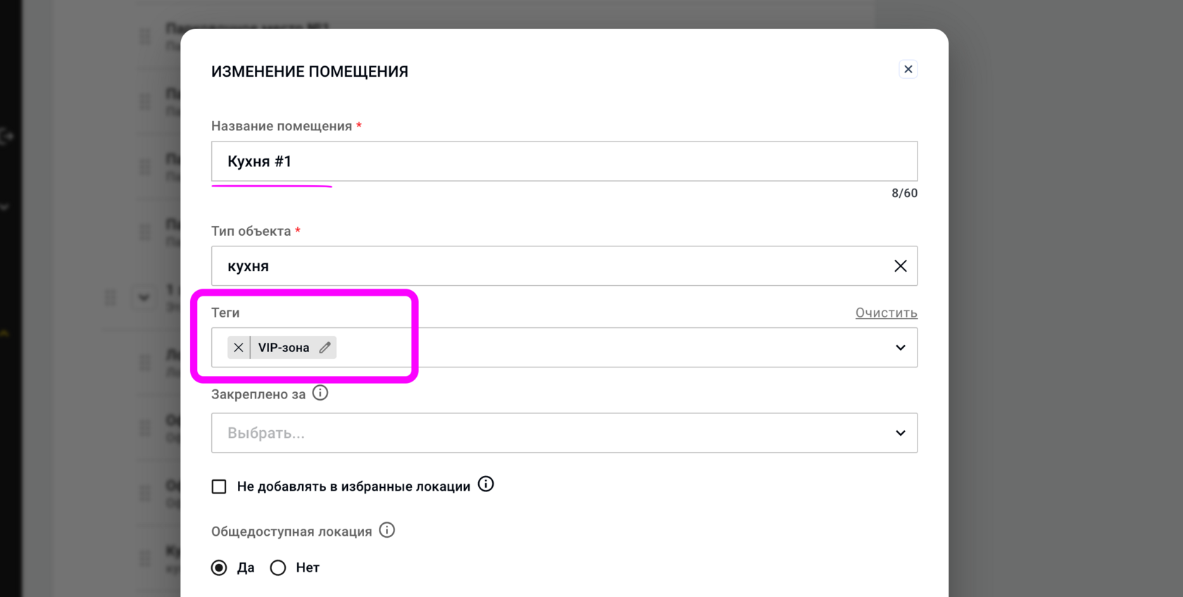 Теги — это простые текстовые метки, которые вы можете назначать на помещения: