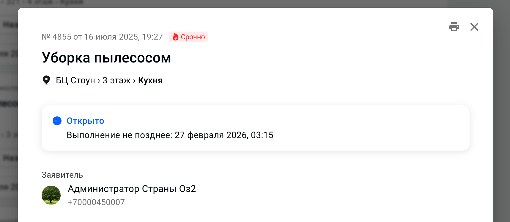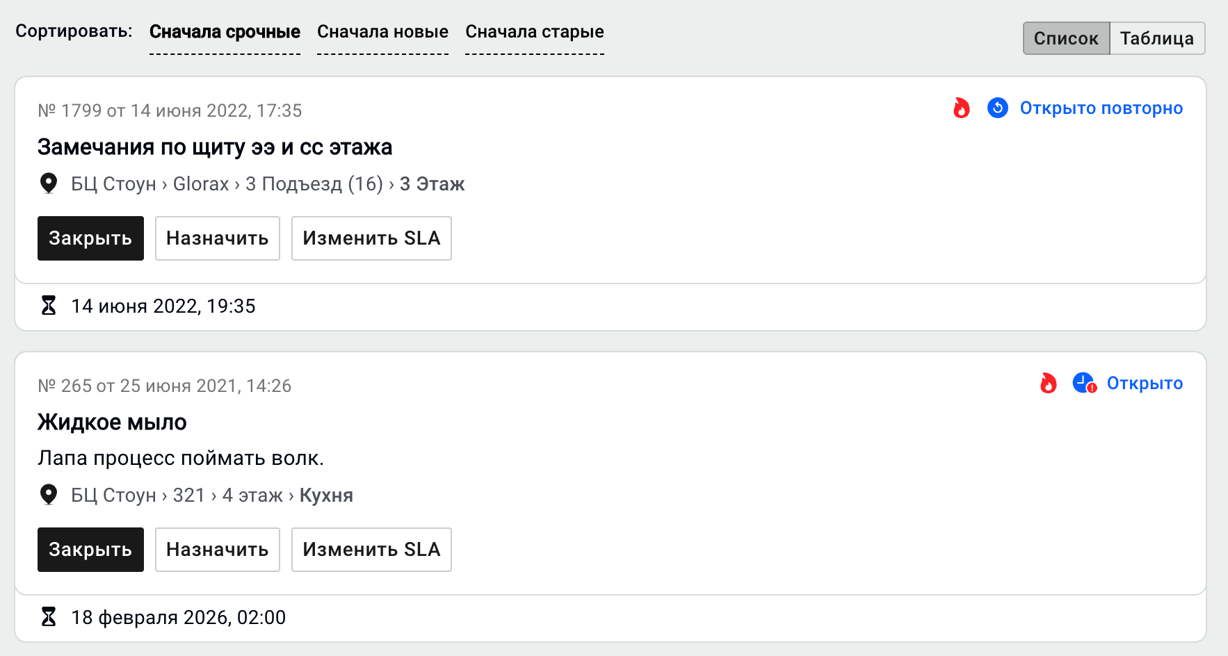В общем списке заявок теперь легче ориентироваться благодаря иконкам локаций и яркому статусу. Кнопки действий стали доступнее, а информация о просроченных SLA теперь видна еще отчетливее.
