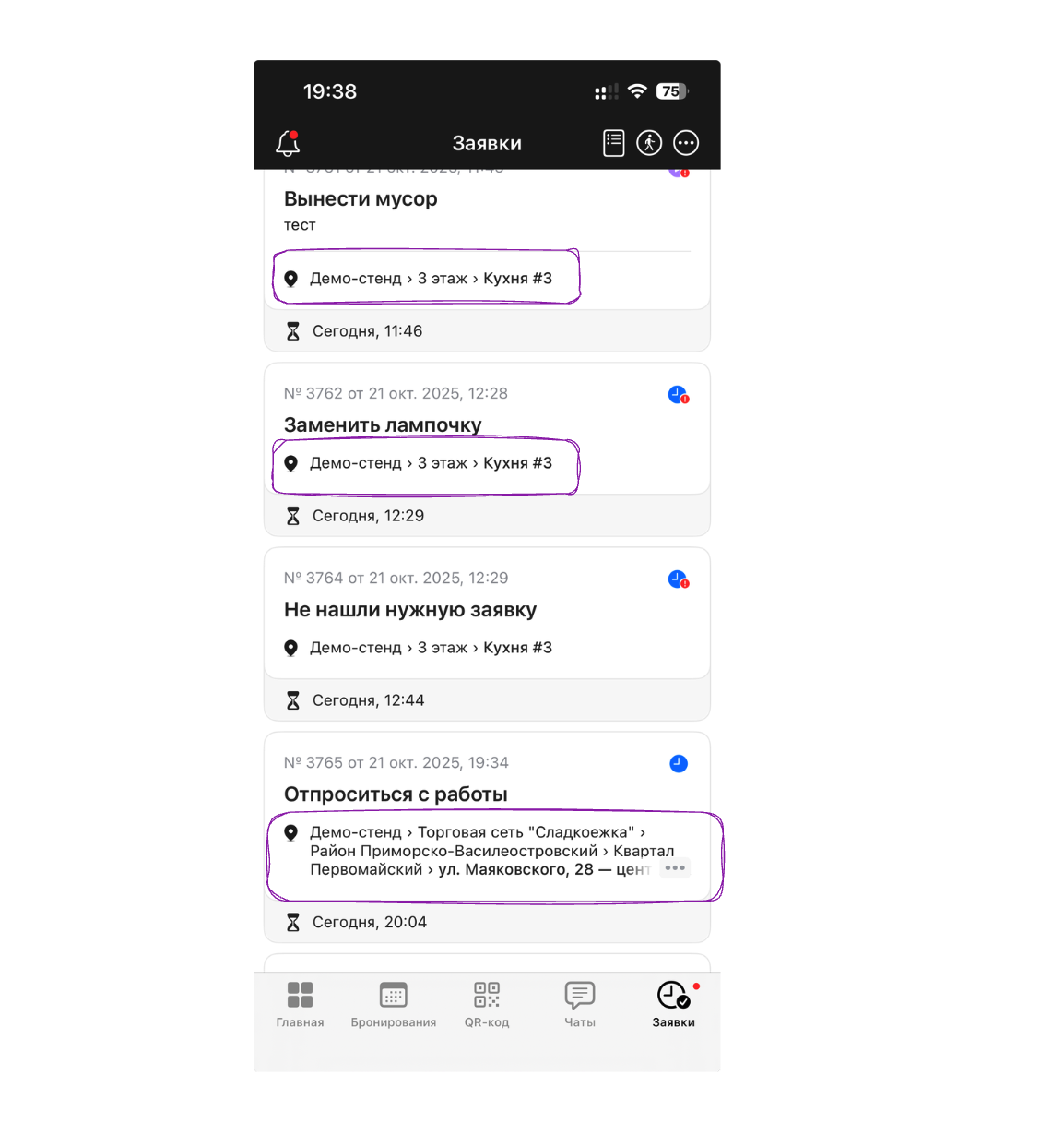 Теперь в списке заявок отображается полный путь локации, а не только название последнего уровня (например, «Туалет» или «Кухня»).